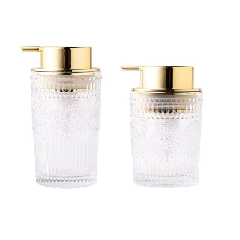 Ervaar elegantie en functionaliteit met onze Glazen zeepdispenser met gouden pomp. Ontworpen om je badkamer te verfraaien en je zeep stijlvol te bewaren, combineert het verfijnd design met dagelijks gebruiksgemak.