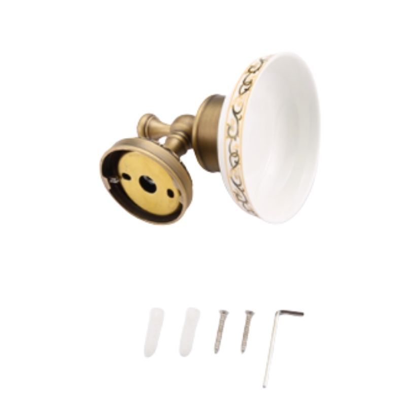 Deze vintage zeephouder voor in de douche is ontworpen om zowel mooi als praktisch te zijn. De robuuste constructie van messing met een antieke afwerking garandeert duurzaamheid en weerstand tegen vocht, perfect voor de doucheruimte. De witte keramische schaal is niet alleen eenvoudig schoon te maken, maar is ook prachtig versierd met een delicaat gouden en zwart patroon dat een gevoel van grandeur oproept. Dit patroon is zorgvuldig aangebracht, wat de ambachtelijke kwaliteit van dit item benadrukt. Je hoeft je geen zorgen te maken over roest of slijtage; deze zeephouder is gemaakt om lang mee te gaan en zijn schoonheid te behouden.