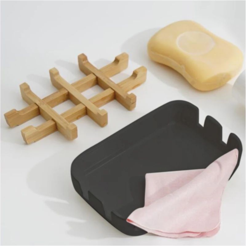 Ontdek ons elegante Zwart zeepbakje met bamboe inleg